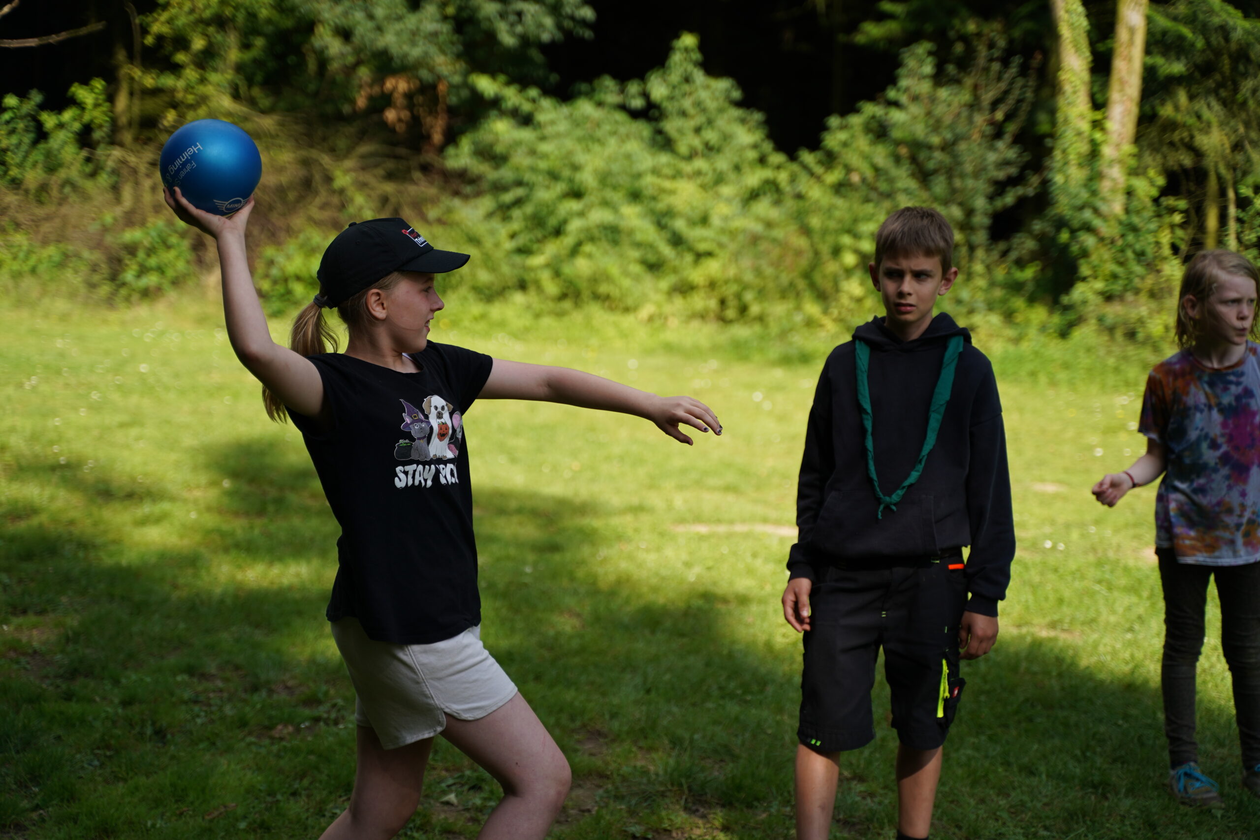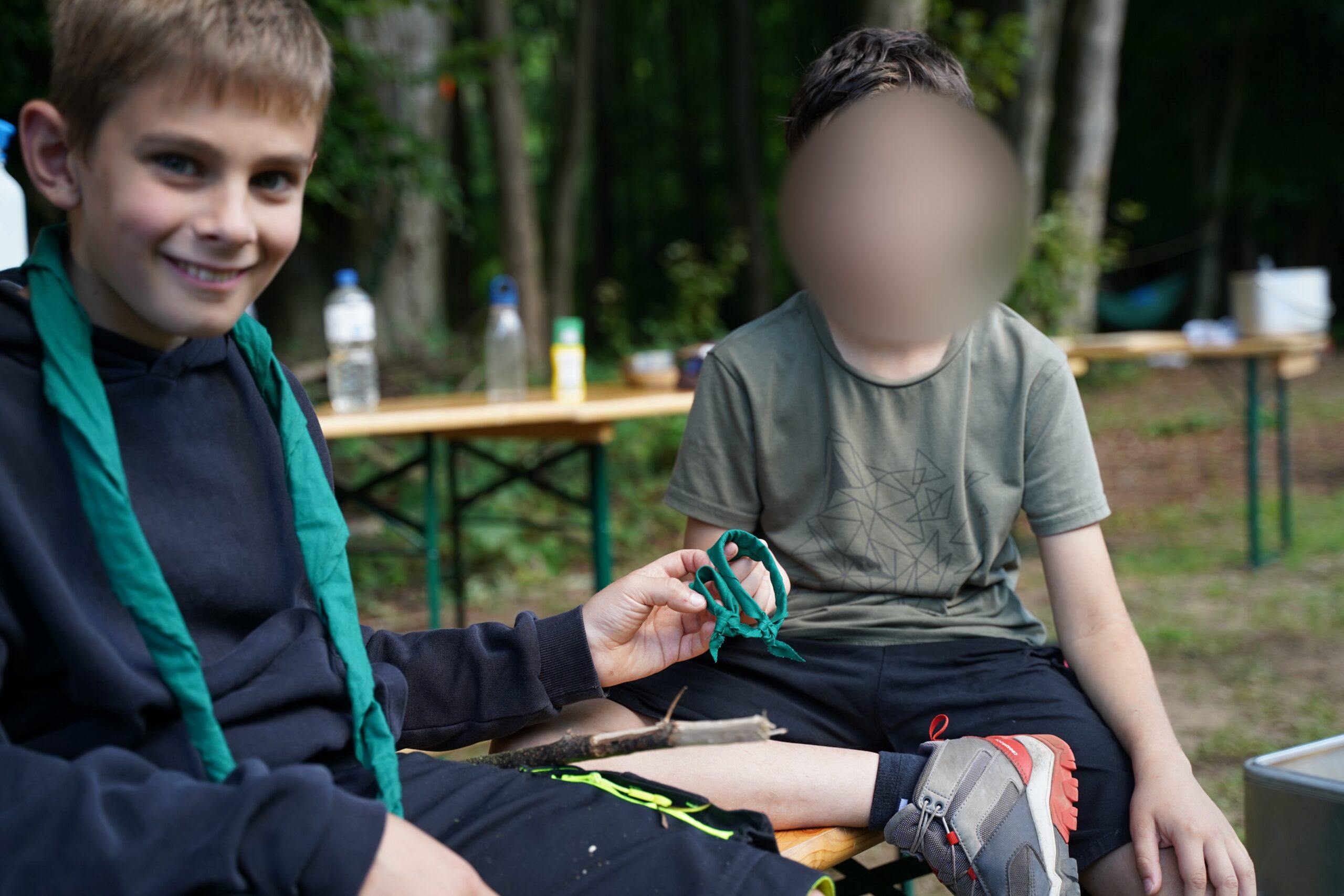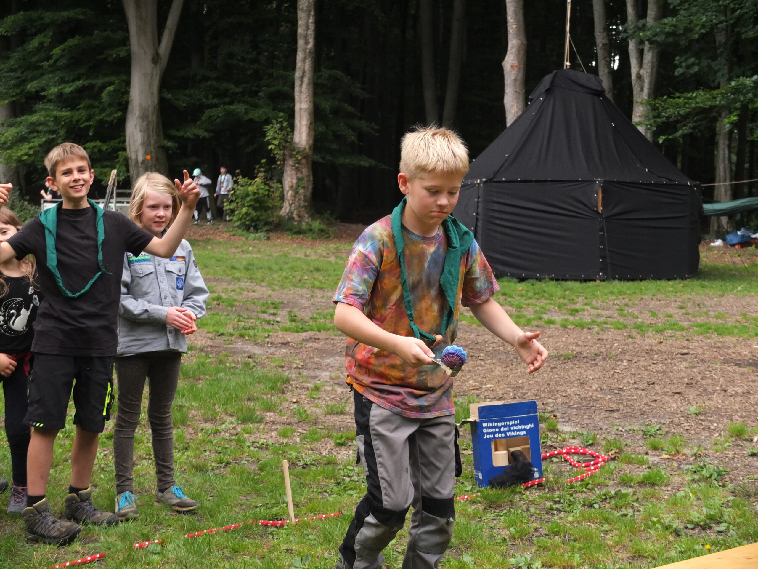 Nach einem stärkenden Frühstück ging es am Donnerstag los mit einem spannenden Spion Spiel, bei dem die Kinder in zwei Teams verschiedene Stationen bewältigen mussten, um den gestohlenen Schatz wiederzufinden. Nach dem Mittagessen veranstalteten wir eine Wasserschlacht, bei der nicht nur die Kinder, sondern auch die Gruppenleitungen ordentlich nass wurden. Als sich die erste Aufregung etwas gelegt hatte, wurden verschiedene Workshops angeboten, von Völkerball spielen bis zu kleinen Mini-Halstüchern basteln für die Kluft aber auch Armbänder knüpfen.